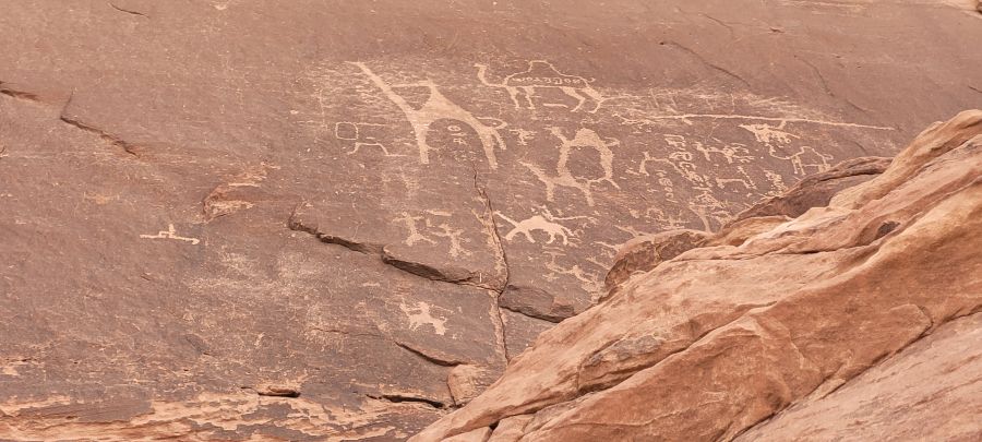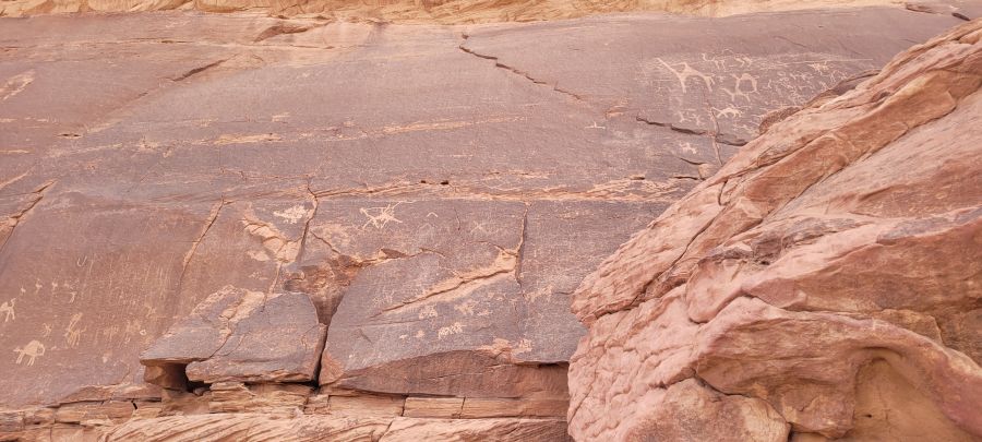 De nuevo en el todoterreno nos dirigimos a Alameleh. En este paraje, las grandes rocas y paredones de arenisca roja producen una capa oscura que fueron preferidos como superficie para los petroglifos, ya que al ser grabados exponen la parte interior más clara de la roca. Esta práctica se extiende sin interrupción a lo largo del Neolítico hasta la era moderna.