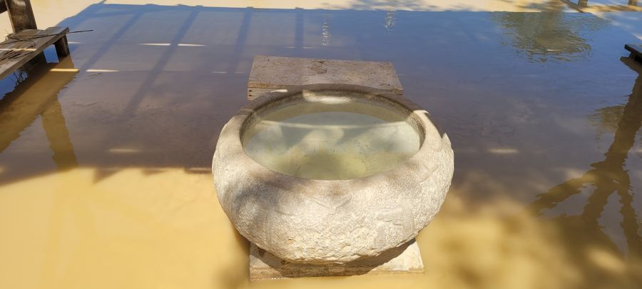 En la parte jordana, una estructura austera de madera simple y efectiva, con un pequeño techo que cobija una pila bautismal, que se mantenía fuera del agua a duras penas por el elevado nivel alcanzado por el agua en el río. De hecho, no veíamos los escalones que dan al río con una pequeña zona acotada para quien se quiera bautizar.
