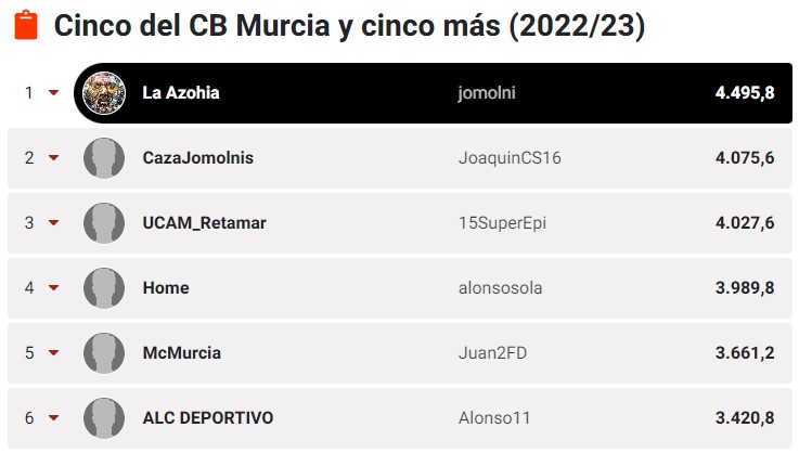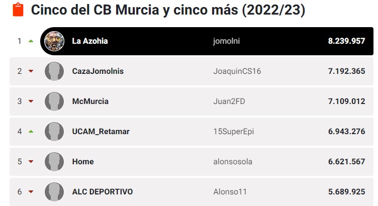 La primera, una privada peculiar, dedicada al equipo de nuestra tierra, el que nos proporciona más éxitos y sinsabores, nuestro CB Murcia. Con una normativa particular, pues exigía la presencia de cinco de sus jugadores jornada a jornada, hiciera frío o calor, disputaran o no partido semanal. Joaquín, Alonso I, Alonso II, Juan y José Antonio han vuelto a ponerlo difícil, pero hemos terminado ganando la clasificación general y la de bróker.