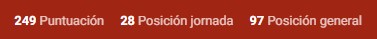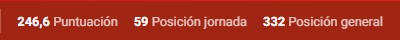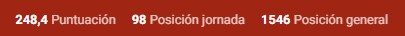 Los «Mejores resultados» muestran una puntuación máxima de 249 puntos; un 28 puesto como mejor posición en una jornada y el puesto 97º como mejor posición en la clasificación general.