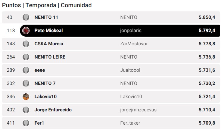 El puesto final alcanzado es el 118º con el equipo Pete Mickeal y sus 5.792,4 puntos, que finaliza en el segundo puesto de la clasificación de la Comunidad.