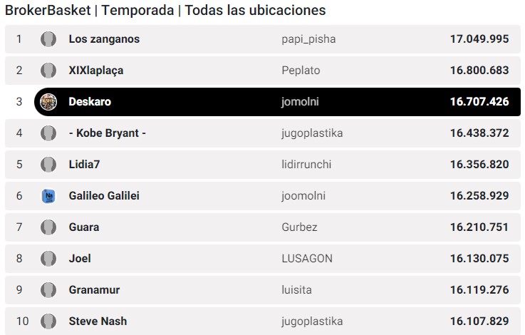 Este año sí hemos disputado la clasificación de bróker. Aunque no se confeccionó ningún equipo claramente con el fin de acumular la mayor cantidad de presupuesto. Sin ser el objetivo principal, el equipo Deskaro llegó a ocupar la primera posición… y no había excusa para intentar lo más alto posible. Ocupando la tercera posición prácticamente toda la segunda vuelta, el equipo ha terminado ocupando el tercer cajón del podio, aguantando los envites de los perseguidores y sin quitarle el ojo a los dos primeros clasificados que, finalmente, han resultado inaccesibles.