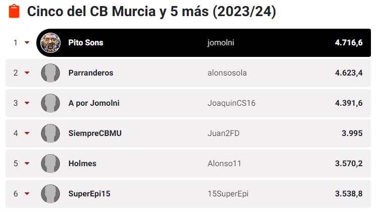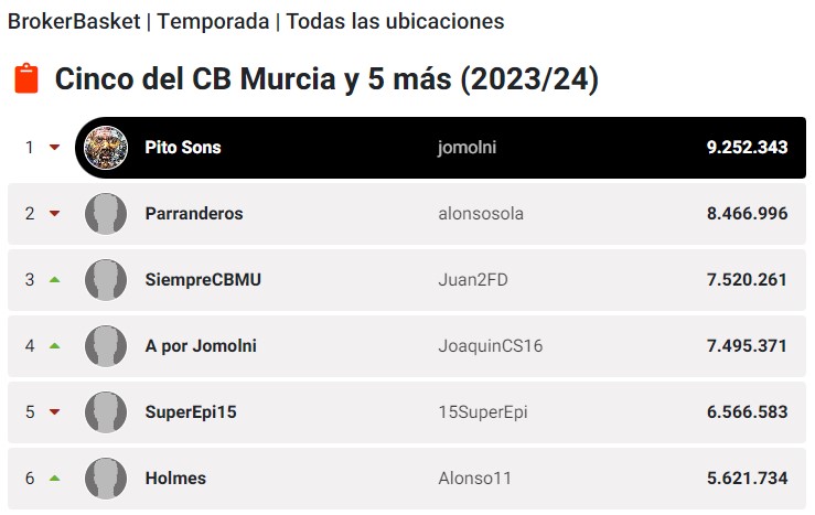 La primera, una privada peculiar, dedicada al equipo de nuestra tierra, el que nos proporciona más éxitos y sinsabores, nuestro CB Murcia. Con una normativa particular, pues exigía la presencia de cinco de sus jugadores jornada a jornada, hiciera frío o calor, disputaran o no partido semanal. Joaquín, Alonso Manzanera, Juan, José Antonio y, sobre todo, Alonso Sola, han vuelto a ponerlo difícil, pero hemos terminado ganando la clasificación general y la de bróker.