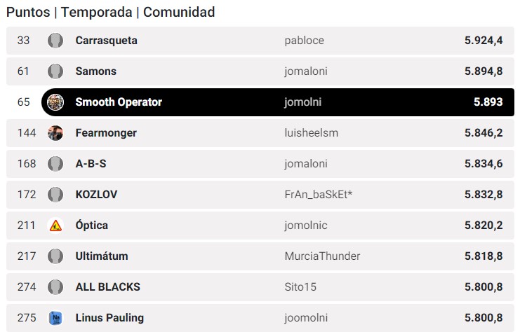 El puesto final alcanzado es el 65º con el equipo Smooth Operator y sus 5.593 puntos, que finaliza en el tercer puesto de la clasificación de la Comunidad.