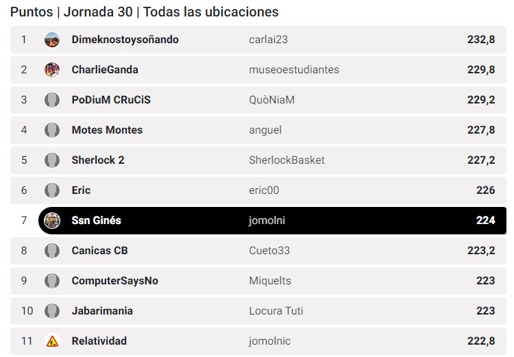 Los «Mejores resultados» muestran una puntuación máxima de 284 puntos y un 7º puesto como mejor posición en una jornada (Jornada 30, con el equipo Ssn Ginés).
