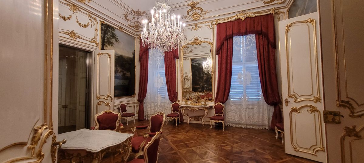 Decorado con espejos, adornos dorados y frescos de techo, constituye una obra de arte total del periodo rococó. Los frescos son obra del pintor italiano Gregorio Guglielmi y glorifican el reinado de María Teresa.