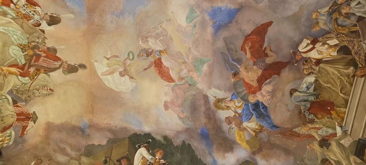 En el fresco central puede ver a Francisco Esteban y María Teresa en el trono, franqueados por las personificaciones de las virtudes monárquicas, así como por alegorías de los dominios de la monarquía.