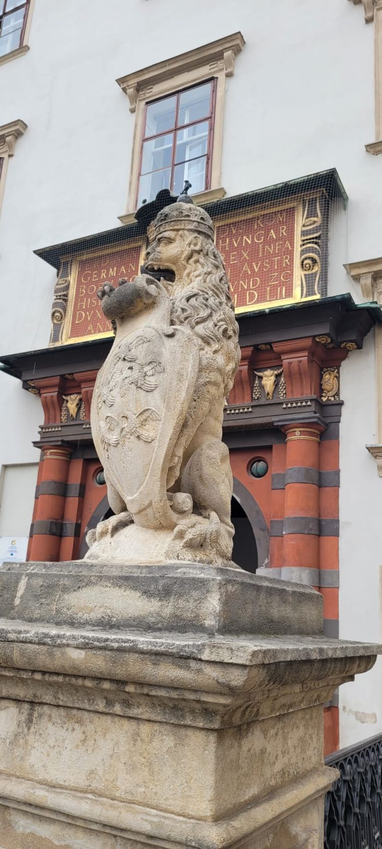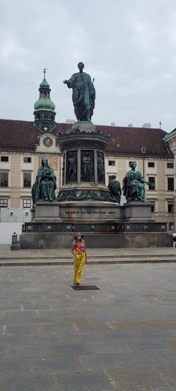 Accedimos al Patio In der Burg («en el Castillo«), presidido por el monumento en bronce de Francisco José I (1846) y flanqueado por edificios renacentistas y barrocos. El ala que queda a espaldas del monumento a Francisco José es el Castillo de Amalia, esposa de José I, construido a finales del siglo XVI; en el siglo XVIII se añadió la Torre del Reloj con el reloj astronómico. El ala a continuación, frente a la Leopoldina, es la de la Cancillería Imperial, realizada en el siglo XVIII en estilo barroco tardío. A la derecha se encuentra la última ala, precedida por el antiguo foso, la cual forma parte del Palacio Antiguo, de tipo fortaleza, a la que se accede a través de la renacentista Puerta de los Suizos (1552).