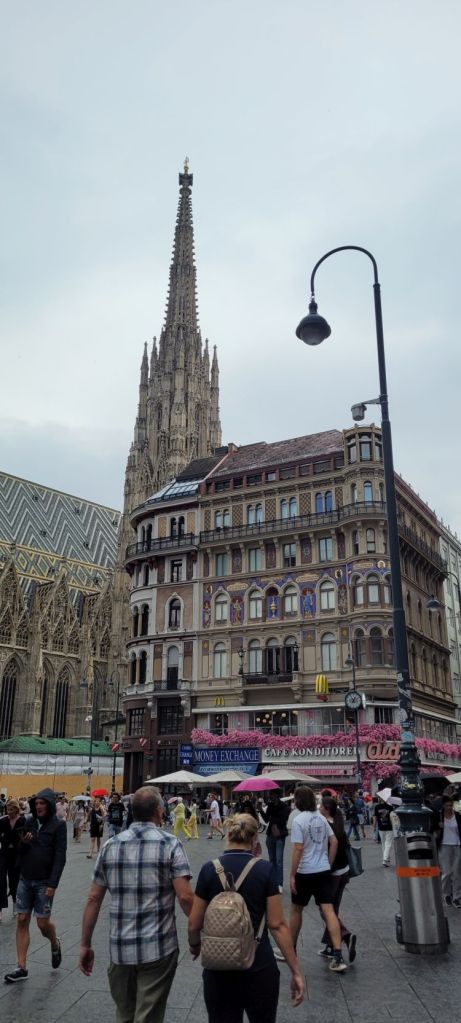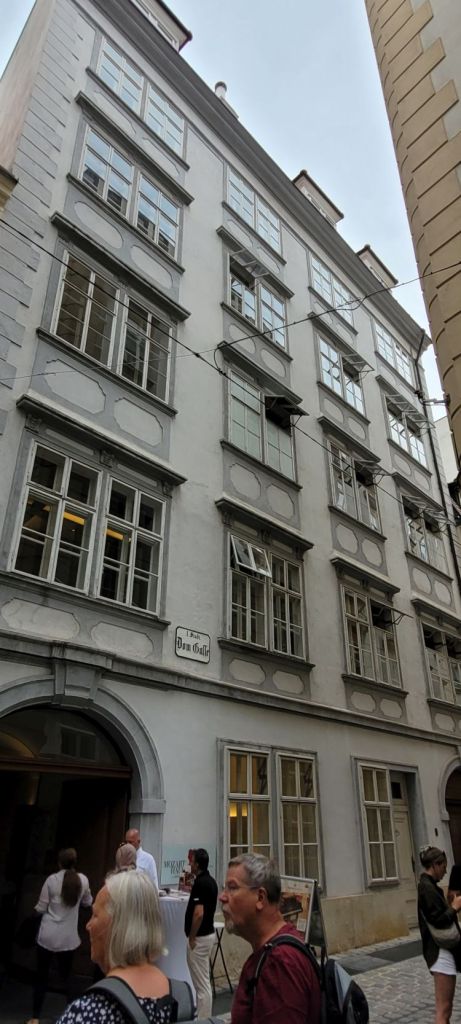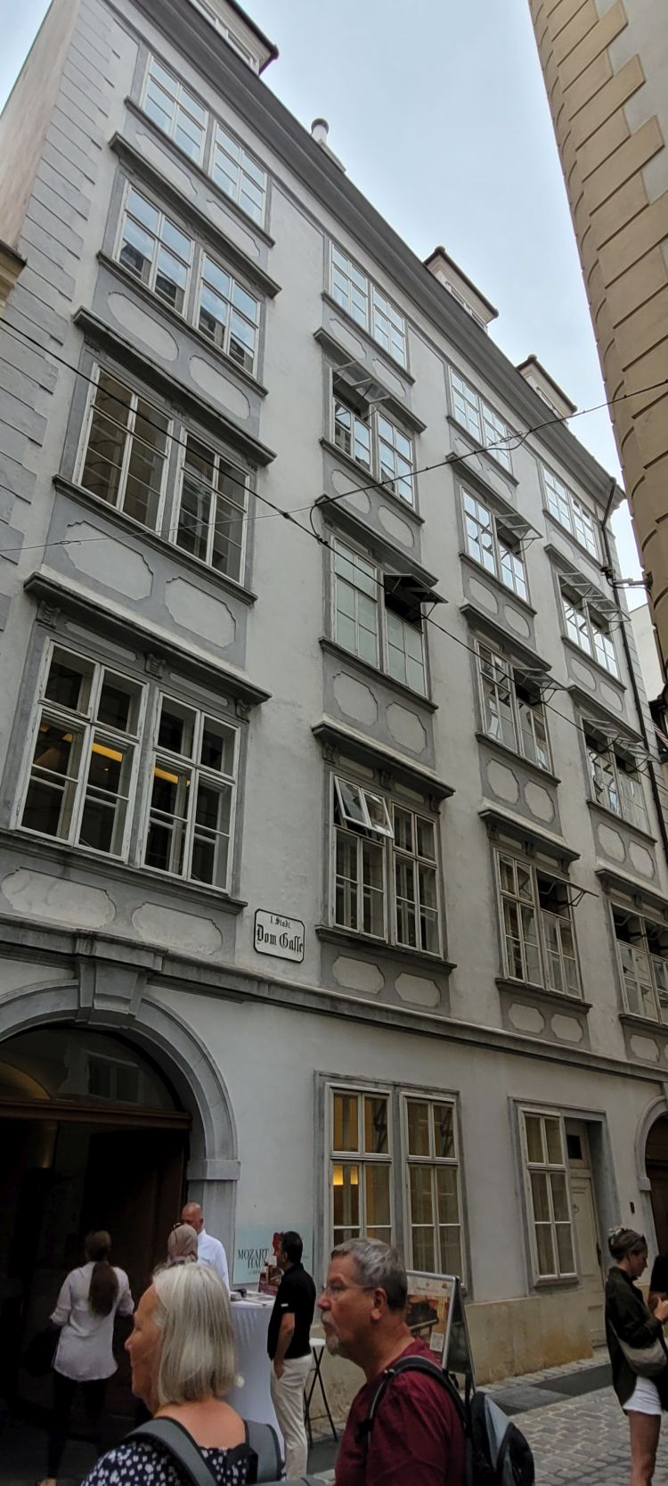 De camino a la Casa de Mozart (Mozarthaus Vienna) nos acompañó una fina lluvia, la última de nuestra estancia en Viena. Esta casa presenta la vida y obra del genio musical, los algo más de diez años que Mozart vivió en Viena (sus últimos años hasta su fallecimiento en la capital austriaca), los años de apogeo de su producción creadora, durante los cuales creó muchas de las obras que le aseguraron un puesto único en el mundo de la música.