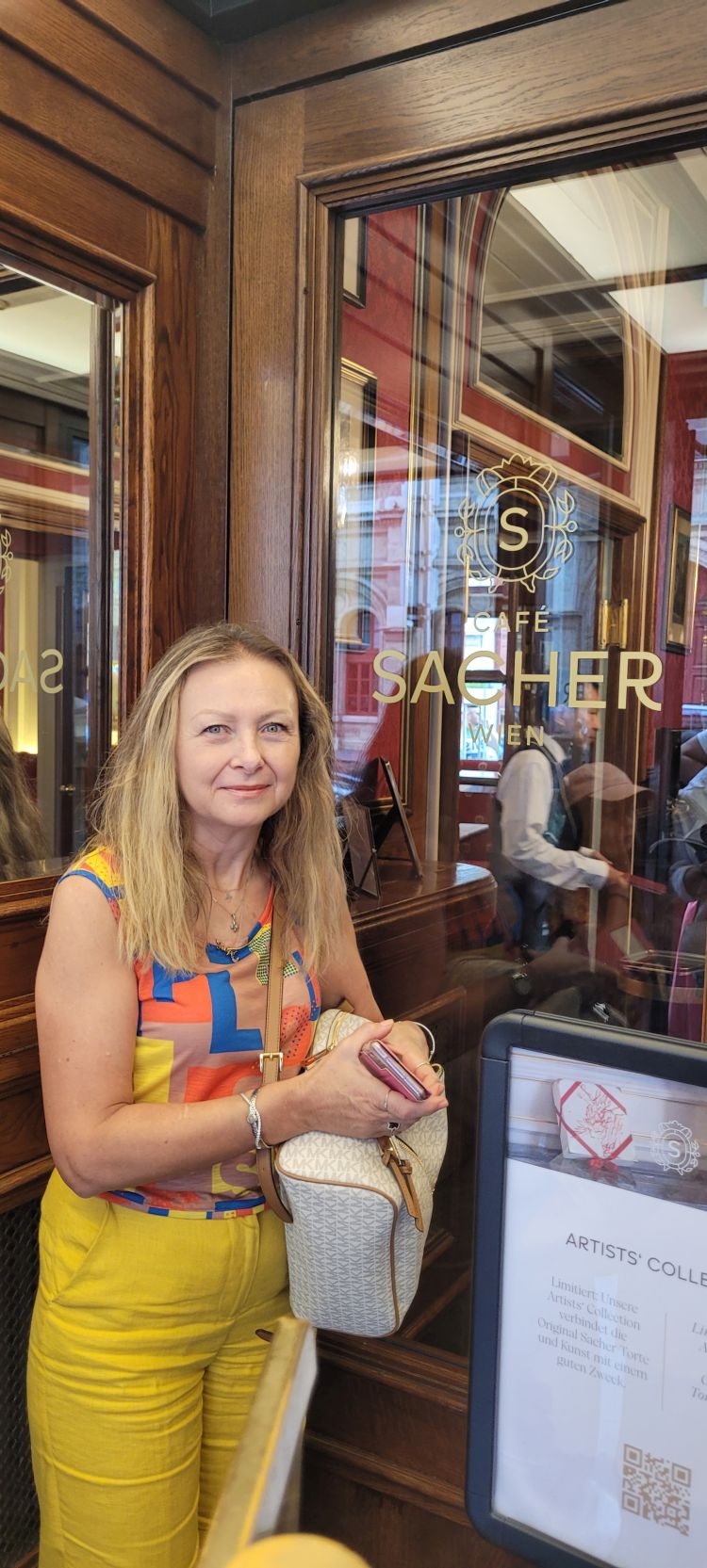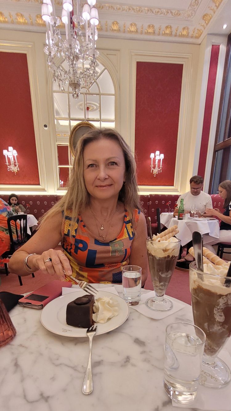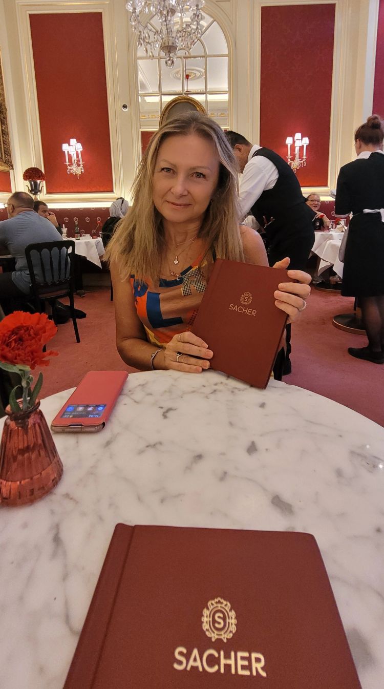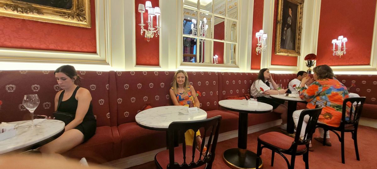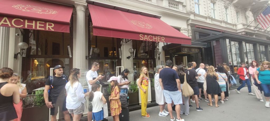 Dado que era imposible reservar mesa, nos tocó hacer cola en la puerta del Café Sacher Wien (Philharmoniker Str. 4, 1010 Wien) para degustar la original tarta Sacher (Sacher-Torte), cuya receta se mantiene en secreto desde que fue creada en 1832 por el joven aprendiz de cocina Franz Sacher para agasajar a los invitados del Príncipe de Metternich y desde entonces es conocida internacionalmente.