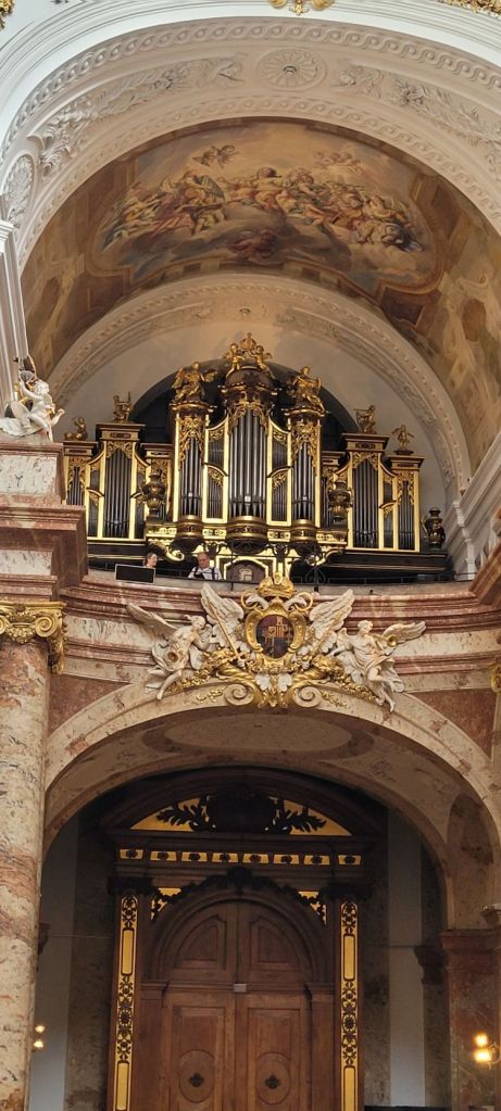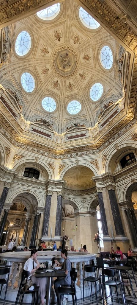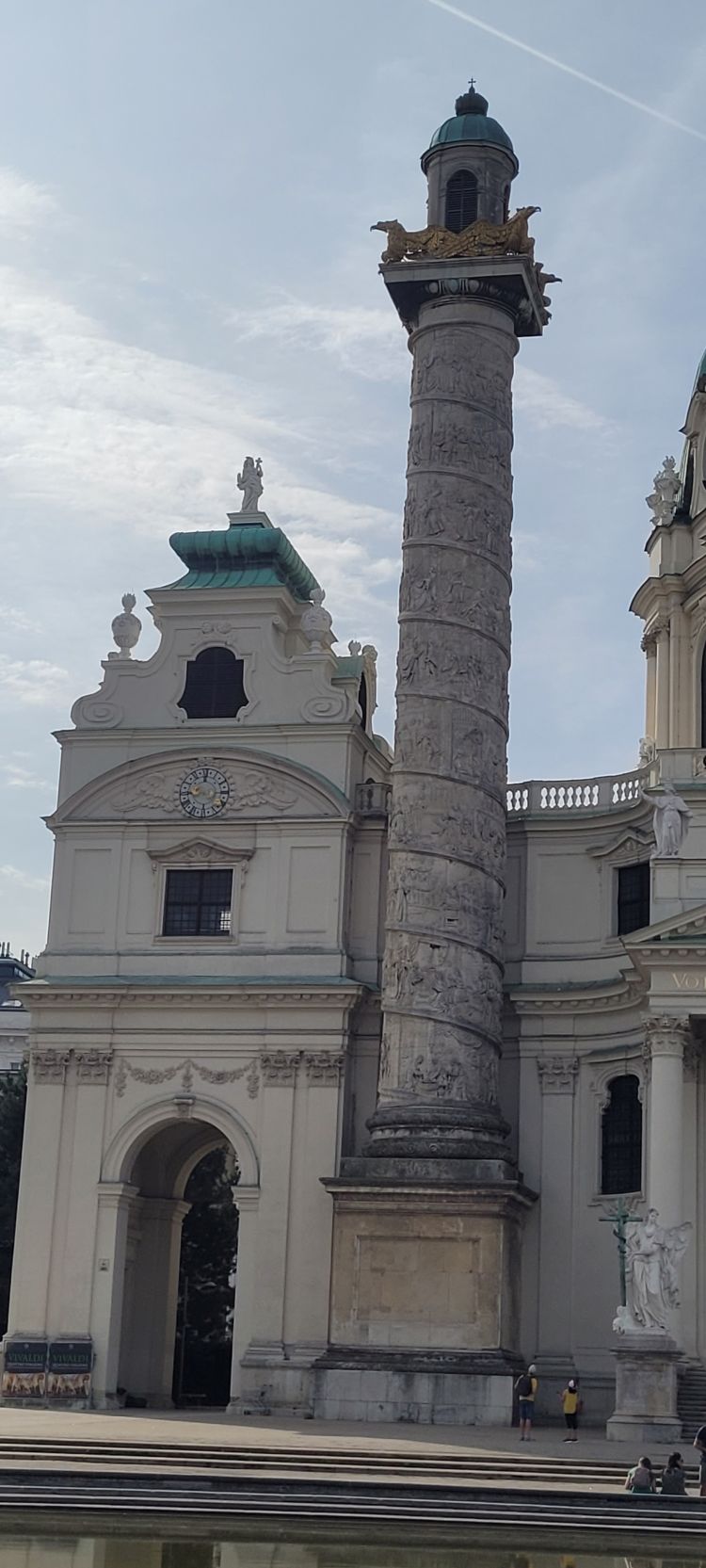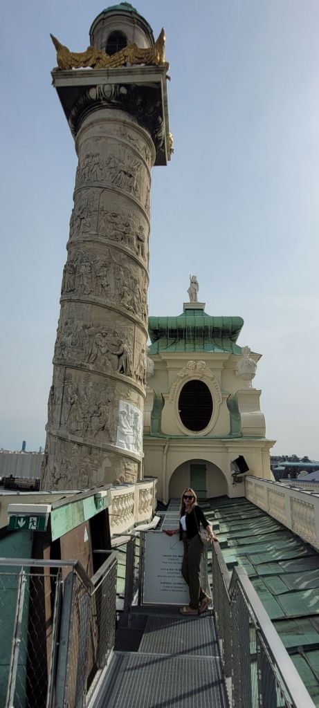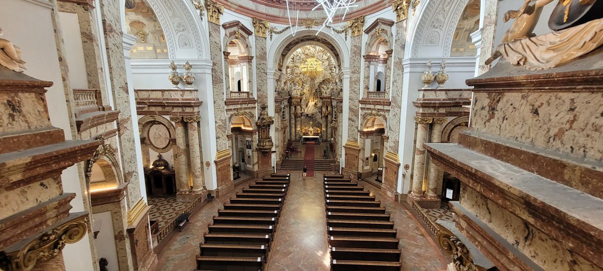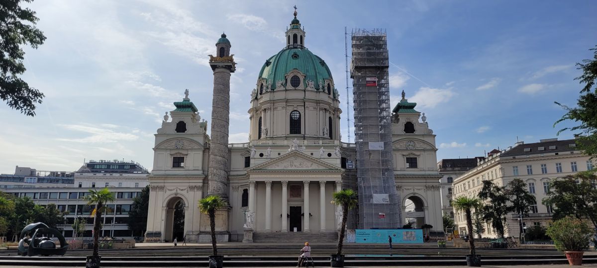 Comenzamos nuestro tercer día en Viena visitando la iglesia de San Carlos Borromeo (Karlskirche), situada en la Plaza de Carlos (Karlsplatz), en el distrito cuatro aunque muy cerca del primer distrito. Es, sin duda, una de las más bellas obras del barroco en Austria, si bien combina varios estilos arquitectónicos: fachada central de estilo griego, columnas exteriores de inspiración romana y decoración interior barroca.
