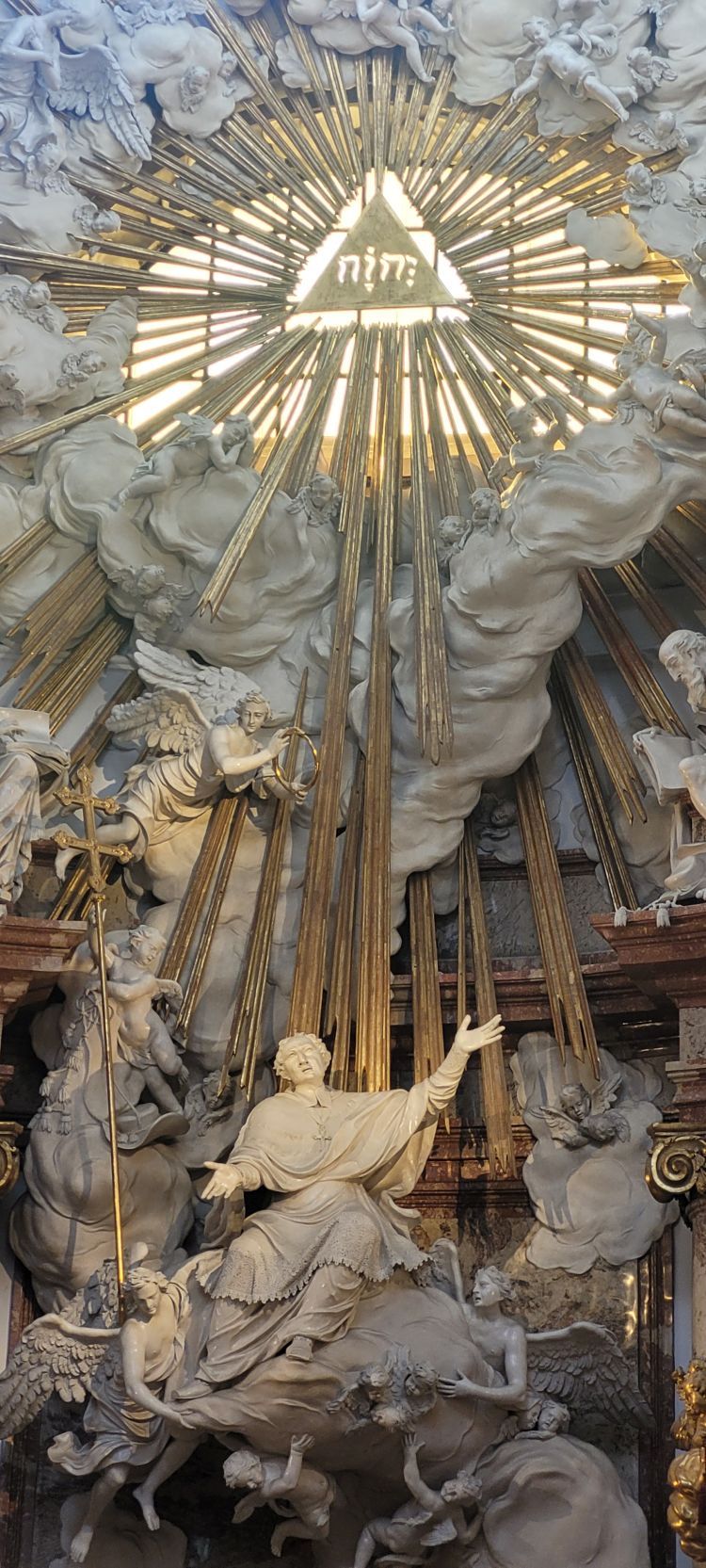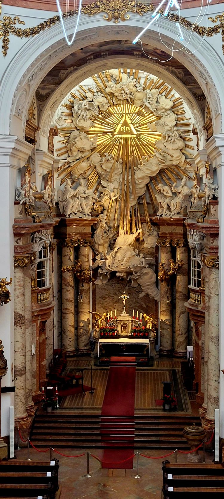 El interior de la iglesia, de planta oval, se presenta amplio y luminoso gracias a su enorme cúpula oval y a los grandes ventanales. En la cúpula se puede contemplar el fresco La Gloria de San Carlos Borromeo, de J.M. Rottmayr. Muy destacable también es la rica decoración barroca del interior.