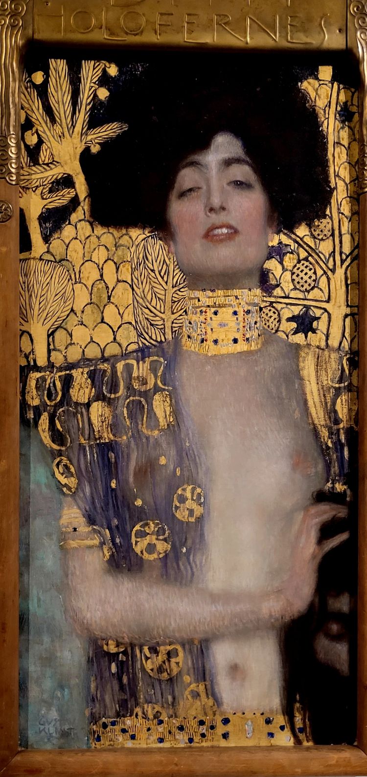 La mirada de Judith (1901) es lasciva. Sus ojos entreabiertos, la boca ligeramente abierta. La bíblica Judith, seductora, es la figura principal y domina la escena de la obra. Su torso está al descubierto, sólo un delicado velo de un color violeta azulado cubre su pecho derecho. Las joyas lujosas decoradas con piedras preciosas y el paisaje como el fondo dorado de un retablo medieval acentúan su sensualidad. Con cierta ternura apoya su mano sobre la cabeza degollada de Holofenes, como queriendo empujarla fuera del cuadro.