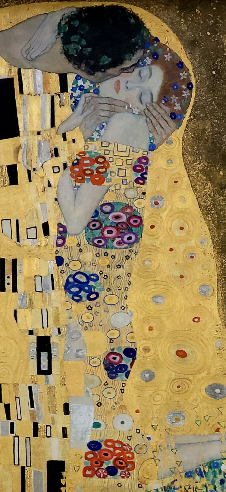 Klimt envuelve al hombre y a la mujer en una aureola dorada apartando así a la pareja de amantes de la realidad. Eleva al beso a un símbolo intemporal y universal del amor. El fondo parece ser un cielo estrellado. Tan solo el prado de flores constituye una referencia terrenal en el infinito del cosmos.