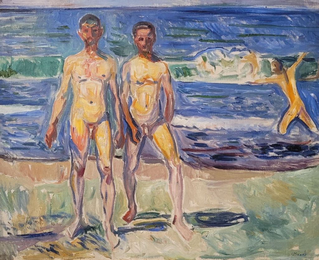 En El beso, acabado en 1909, encontramos una pareja de amantes en una pradera llena de flores en ese momento tan prometedor antes del beso. El hombre está de pie. En su cabeza lleva una corona de hiedra. Se acerca a los labios de la mujer que sin fuerzas ha caído de rodillas ante él. Ella le ofrece su boca y su mejilla para el beso. Llena de devoción ha cerrado los ojos y envuelve con el brazo el cuello del hombre, rozando suavemente su mano. Los rasgos del hombre son angulosos y el ornamento de su túnica es de forma rectangular. Suaves y blandos son, en cambio, los rasgos de la mujer y su vestido muestra un estampado floral como la pradera de flores.