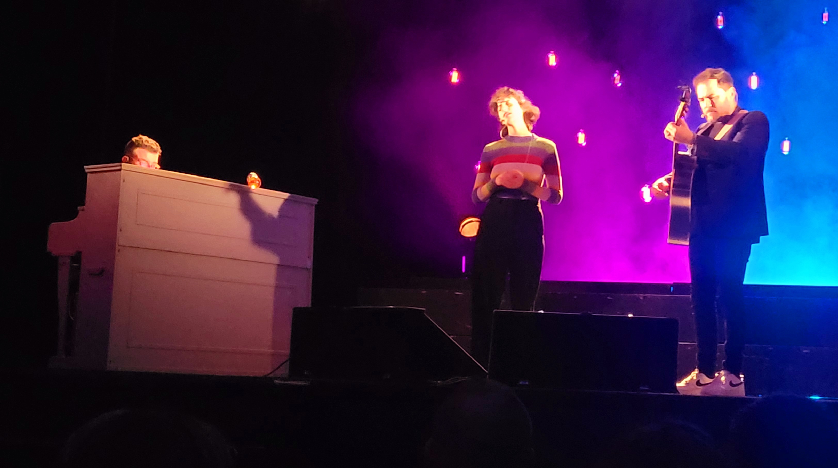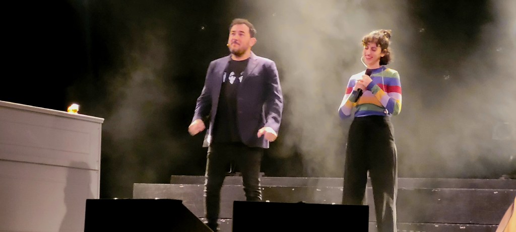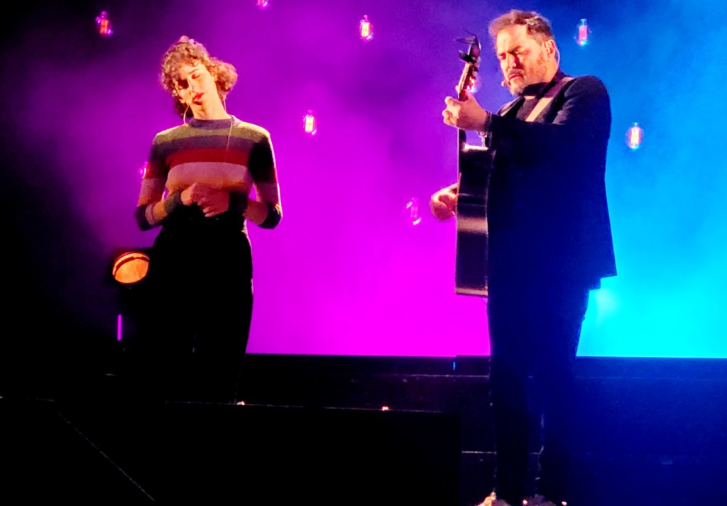 Sin embargo, todo el protagonismo fue para una chica que teníamos sentada en la fila de atrás, que intentó poner en aprietos al cantante “pidiendo que tocara alguna canción alegre”. Tras algún diálogo posterior con el cantautor la sorpresa fue que salió al escenario a acompañarle en lo que quedaba de concierto. Enseguida comprendimos que no se trataba de una espontánea sino, como se encargó de presentar más tarde, de la actriz María Pascual.