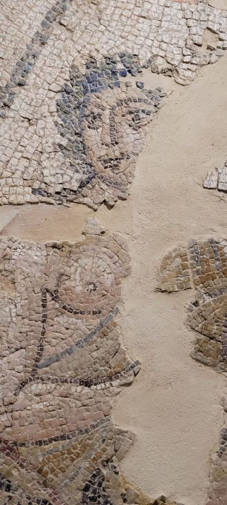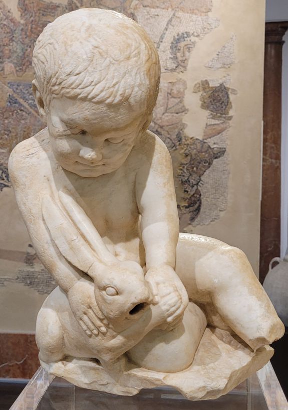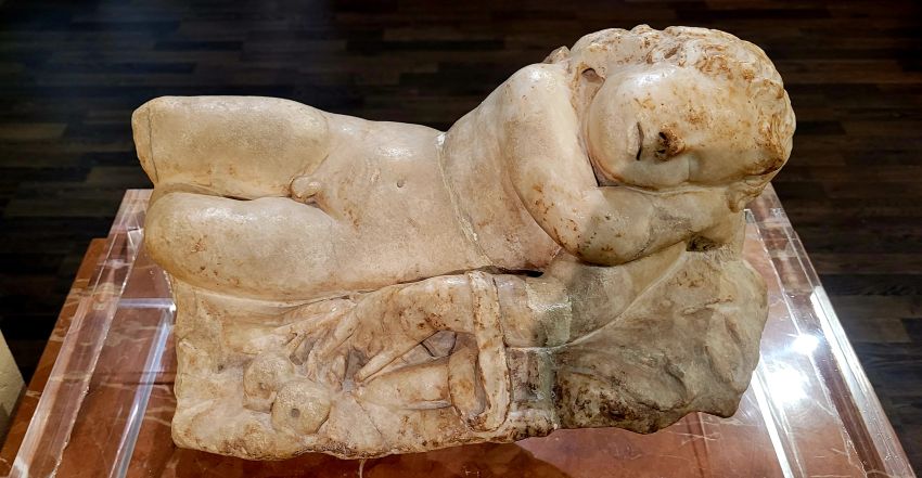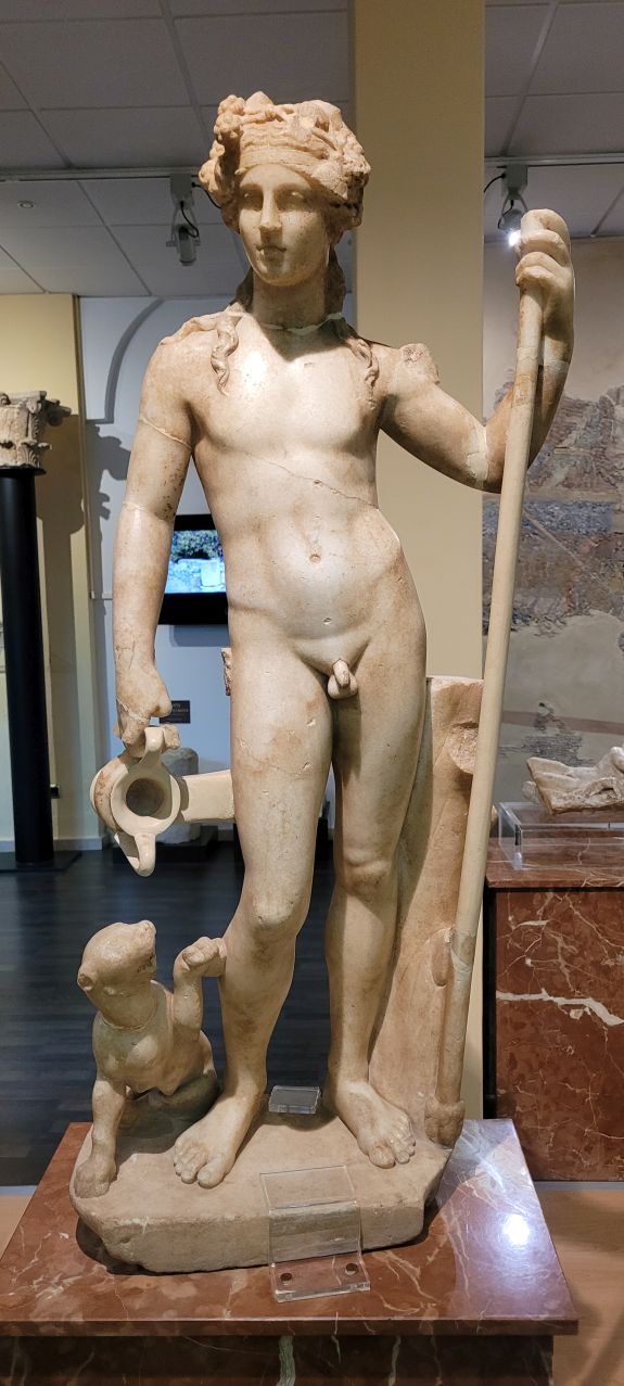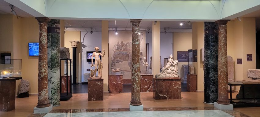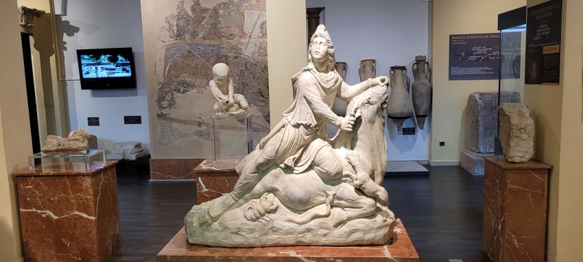 Además de los mosaicos que se extrajeron en los años setenta del siglo pasado, y que se encuentran anclados en varias paredes de la sala de exposición y en el patio, también se exponen las esculturas de mármol de Dioniso y de Eros dormido y la estatua-fuente representando un niño agarrando una liebre. La figura del dios Mitra que se expone es una copia realizada por un escultor del Museo Nacional de Reproducciones Artísticas.