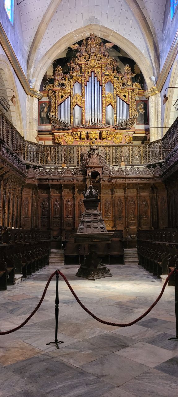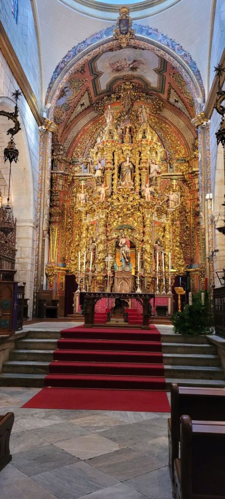 El interior del templo, con bóvedas tardogóticas, consta de tres naves y capillas. Frente al presbiterio destaca el coro, cerrado por muros y rejería, en el que puede contemplarse un magnífico conjunto de 85 sillas del siglo XVI. Desde el crucero se accede al claustro de estilo manuelino y separado del patio central por una balaustrada de columnas torcidas.