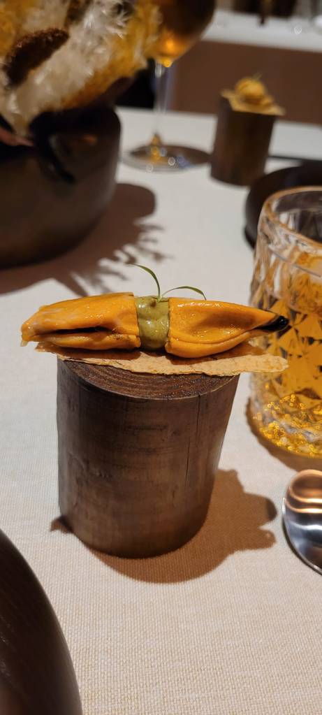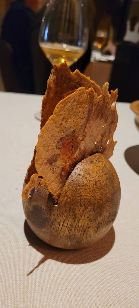 Era el momento de sacar el pan. Un Pan brioche caliente al momento acompañado por una deliciosa mantequilla artesana previo a los Entrantes, que comienzan con un Tortellini de gamba roja al ajillo, Néctar de sus cabezas y Fósil.