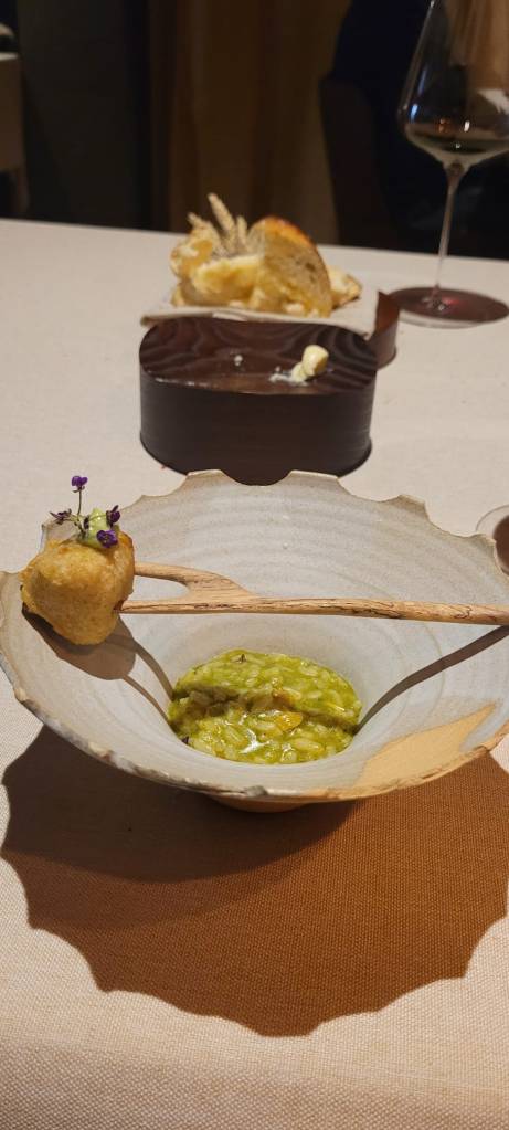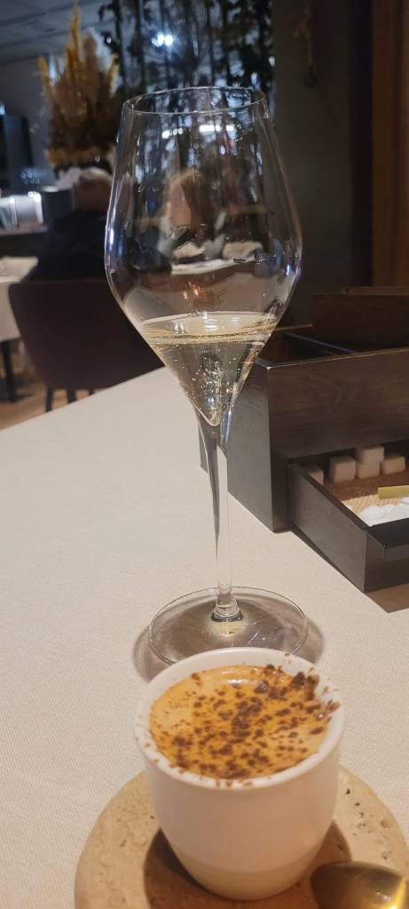 De postre principal, Chocolate, leche a la brasa y pino. Un magnífico colofón a un exquisito menú de principio a fin, acompañado por una copa de champán, cortesía de la casa. Otro detalle que agradecer.