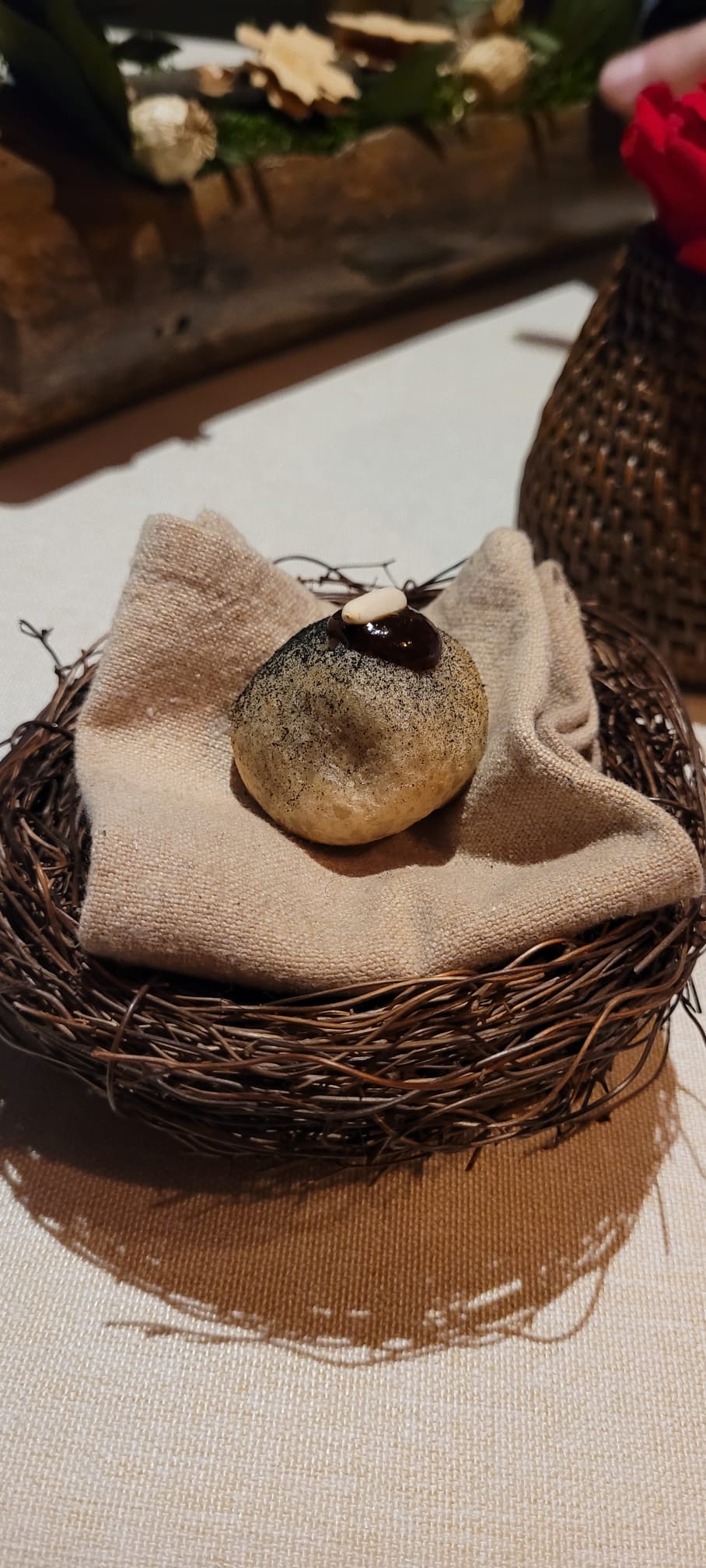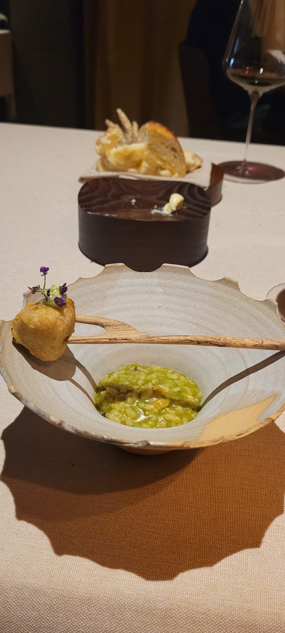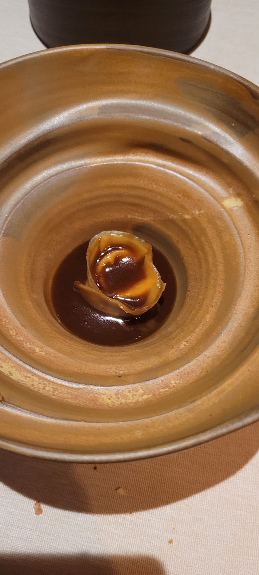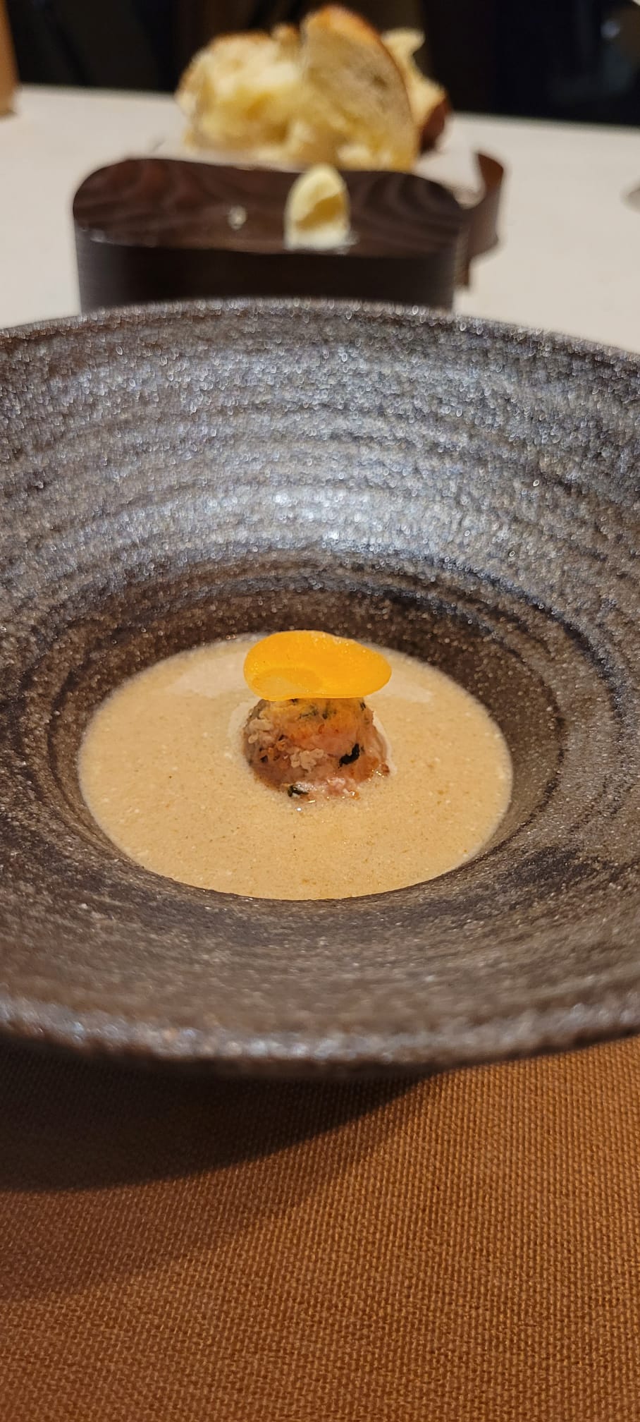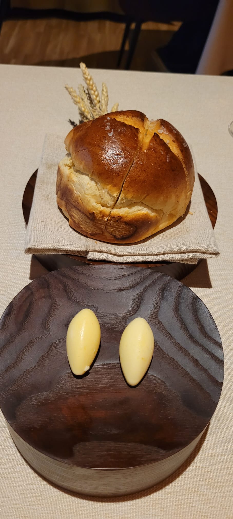 Era el momento de sacar el pan. Un Pan brioche caliente al momento acompañado por una deliciosa mantequilla artesana previo a los Entrantes, que comienzan con un Tortellini de gamba roja al ajillo, Néctar de sus cabezas y Fósil.