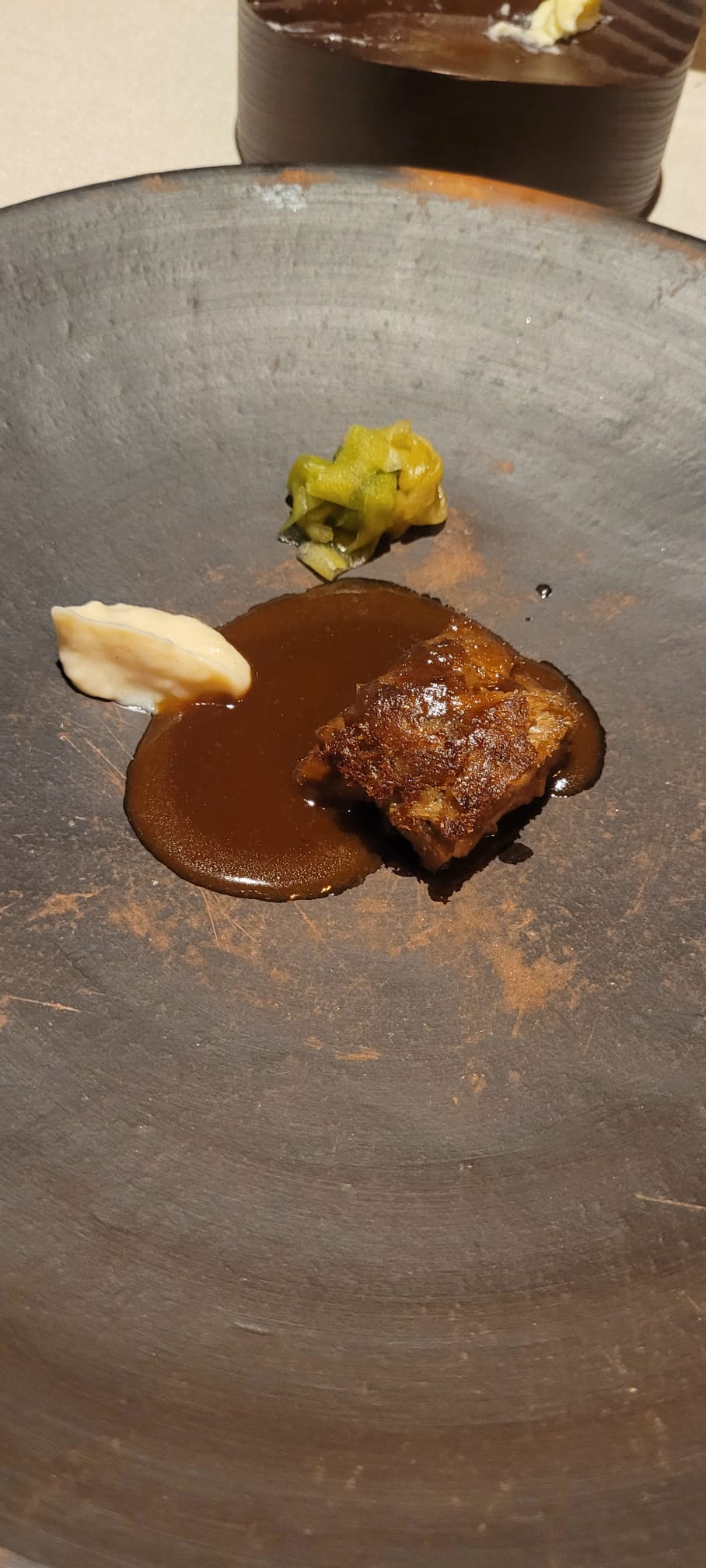 En el Principal vuelve a cobrar protagonista el chato murciano en forma de Royal de Chato, Tubérculos (chirivía) confitados en mantequilla tostada y pepino fermentado. Una carrillera que se deshace en la boca, superjugosa y sabrosísima.