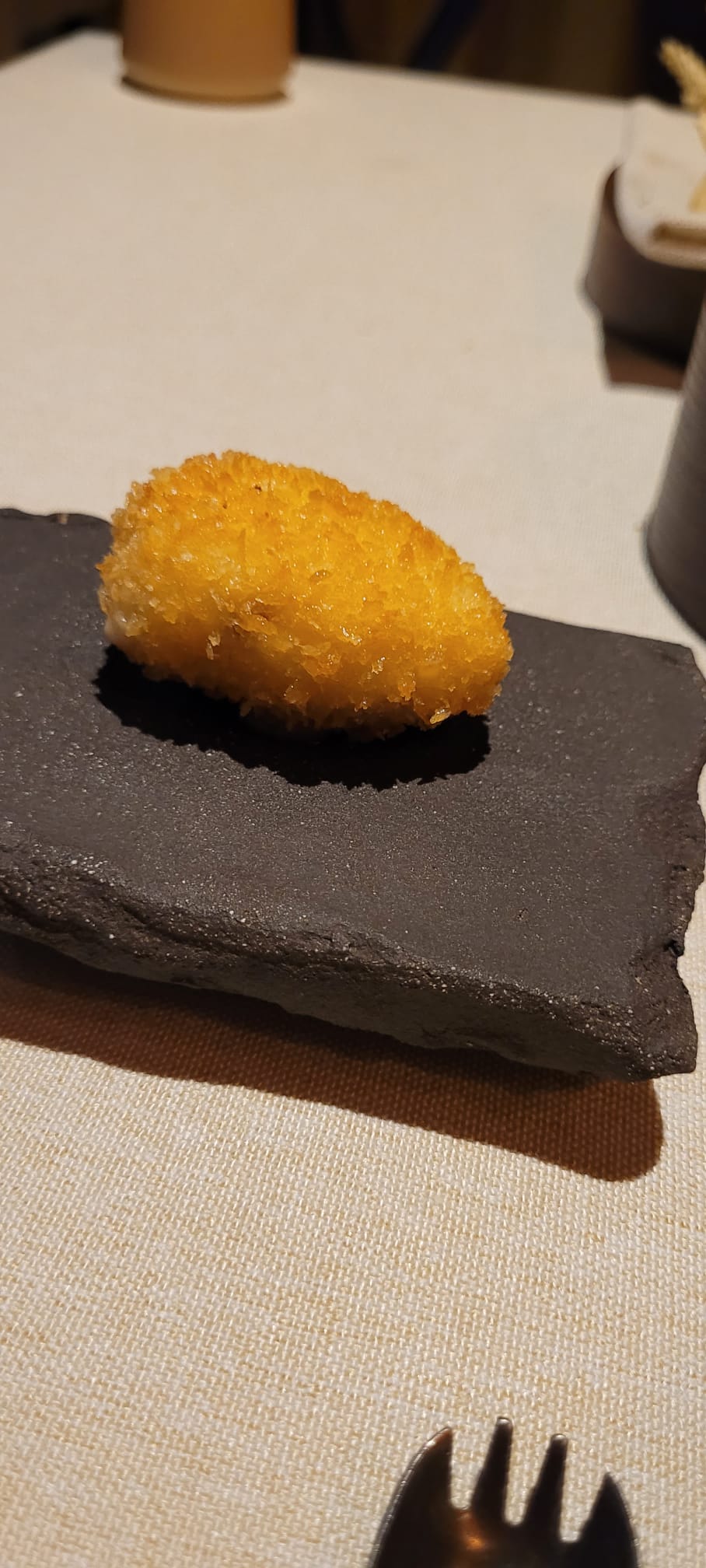 Uno de esos platos con un fondo potente. La gamba no era de Denia, pero la de Águilas también es de categoría. El fósil, elaborado con sus carcasas, está muy conseguido y nos recordó a la versión de la tortita de camarones que degustamos en Cádiz.