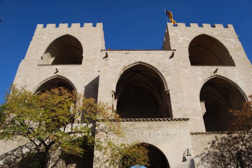 Comenzadas a construir en 1392 por Pere Balaguer, Las Torres de Serranos nacen como defensoras de uno de los accesos más usados de la Valencia antigua. En 1865 se derriban las murallas y quedan exentas. Desde 1586 hasta 1887 son utilizadas como cárcel de nobles.