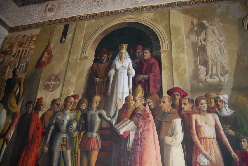 Tras una puerta de arco gótico aparece la Sala de la Galera o de los Embajadores, cubierta con un artesonado en forma de barco invertido. Fue mandada construir por la madre de Juan II: Catalina de Lancaster. En una de las paredes de la sala se narra a través de una pintura del siglo XX la coronación de Isabel como Reina de Castilla: el 13 de diciembre de 1474 salió del Alcázar para ser nombrada Reina de Castilla en la iglesia de San Miguel. Esta obra fue realizada por el artista segoviano Carlos Muñoz de Pablos.
