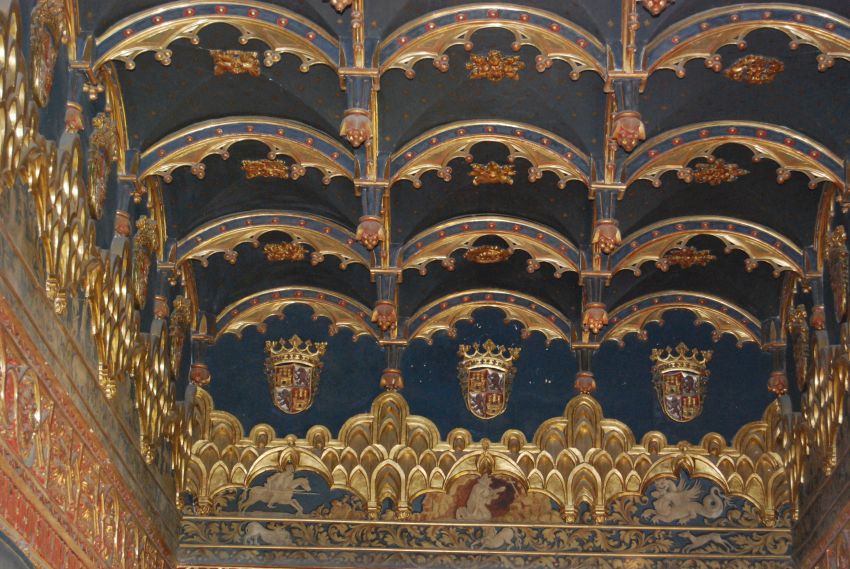 La torre es rematada con almenas, algunas de ellas decoradas con los escudos de Castilla, y con doce torrecillas circulares decoradas en su parte superior con escamas. Esta torre fue empleada como prisión de Estado. Se puede acceder a la parte superior de la torre tras subir 152 escalones por una escalera de caracol. Las impresionantes vistas de la ciudad que se pueden disfrutar desde lo alto, hacen que el esfuerzo merezca la pena. El Patio de armas del Alcázar de Segovia también se construyó en el siglo XIII, aunque el patio actual corresponde al siglo XVI, de estilo herreriano. Consta de una planta irregular y porticada en tres de sus cuatro lados. El primer piso del patio está sustentado por arcadas y el segundo es adintelado. Desde una de las puertas de este patio se accede a la Sala de Ajimeces o antigua Sala del Palacio Viejo. Esta sala fue un encargo del rey Alfonso VIII, y fue denominada “de los Ajimeces” por los antiguos ventanales románicos geminados que se conservan. La Sala de la Chimenea se denominada así por ser la chimenea su elemento principal. Fue reformada en tiempos de Felipe II. Era la sala de despacho y reunión con el consejo. Ésta y otras dependencias fueron decoradas con techumbres mudéjares; desgraciadamente las originales se perdieron en el incendio de 1862, y las que hoy observamos son réplicas exactas siguiendo grabados antiguos. A través de un arco profusamente decorado accedemos al Salón del Trono, que recrea el aspecto que debía tener en época de los Reyes Católicos. La sala se cubre con una cúpula octogonal mudéjar del siglo XV, muy parecida a la que se perdió en el incendio del siglo XIX, pues ambas fueron realizadas por el mismo artista, Xadel Alcalde. La actual se trajo de la desaparecida iglesia de Santa María de Urones de Castroponce (Valladolid). En esta sala se aprecia una pareja de tronos, regalo de Alfonso XII, bajo un dosel con el emblema y divisa de los Reyes Católicos “Tanto Monta”. Era el lugar destinado por los reyes para las audiencias y recibir a diferentes mandatarios y nobles.