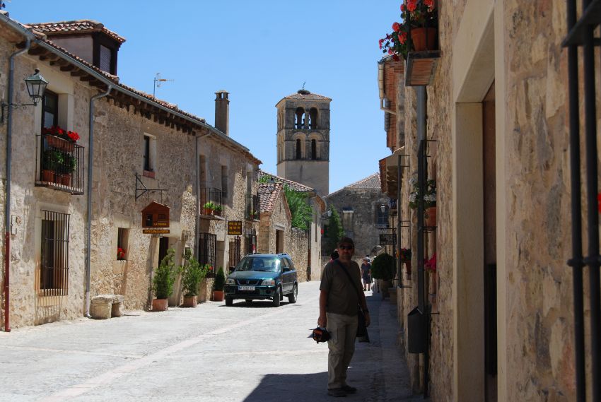 Hora de comer. Nos pareció una buena opción la villa medieval de Pedraza, marco incomparable declarado Conjunto Monumental en 1951, distinguida por los premios “C” de Turismo de Castilla y León en 1993 y Premio Europa Nostra en 1996. Situada a 1.073 m de altitud en el piedemonte segoviano, el promontorio pétreo en el que actualmente se asienta la población está orillado por los arroyos San Miguel y Vadillo que poco más abajo confluyen y se convierten en el Cega.