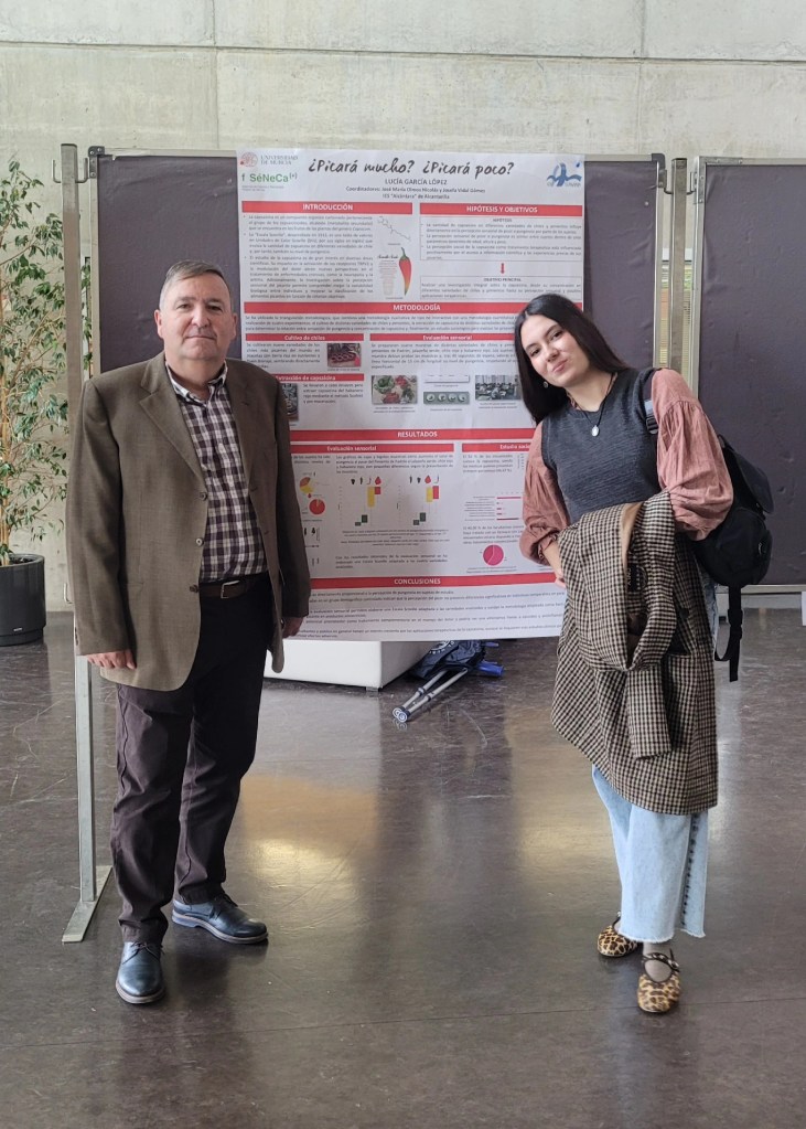 Hoy, algunos de los jóvenes investigadores de nuestro centro han participado, por vez primera, en uno de estos eventos, permitiéndoles establecer una primera toma de contacto con la Universidad de Murcia. Entre ellos, Lucía García López, que ha presentado, como póster, los resultados de su investigación sobre la capsaicina.