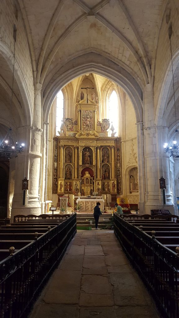 El edificio pertenece al gótico final siendo de aspecto sencillo y sobrio pero de grandes dimensiones. Posee una planta de salón compuesta por tres naves divididas en cuatro tramos, pilares cilíndricos soportando arcos apuntados, bóvedas de nervadura en el crucero y la capilla mayor y cuatripartitas en el resto; posee también un ábside poligonal, coro en el centro y trece capillas laterales abiertas entre los contrafuertes más la sacristía.