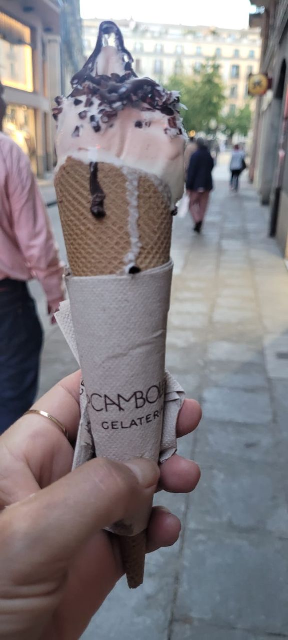 Anochecía. Era el momento de visitar un proyecto mimado y capitaneado con mucho amor por Jordi Roca y Alejandra Rivas: Rocambolesc gelateria. Para ellos los helados son felicidad. Por eso crearon hace siete años este espacio, un mundo de fantasía helada donde puedes darle un lametazo a la mano de Jamie Lanister, morder la cabeza de Darth Vader o darle un bocado a la nariz del propio Jordi. En este caso, comerse un delicioso helado de vainilla bañado en chocolate.