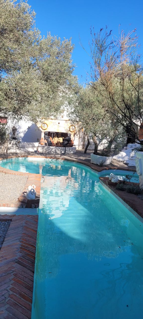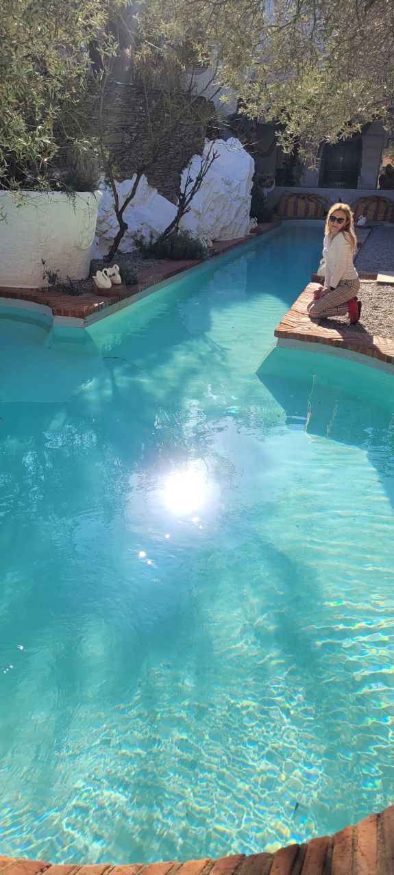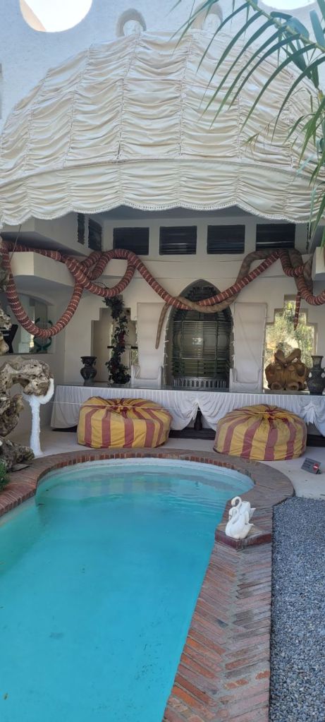 No podía faltar un patio blanco ni una piscina. Pero la piscina de Dalí no podía ser una piscina normal. Ésta está inspirada en las fuentes de la Alhambra, e incluso tiene una especie de jaima en uno de sus extremos.