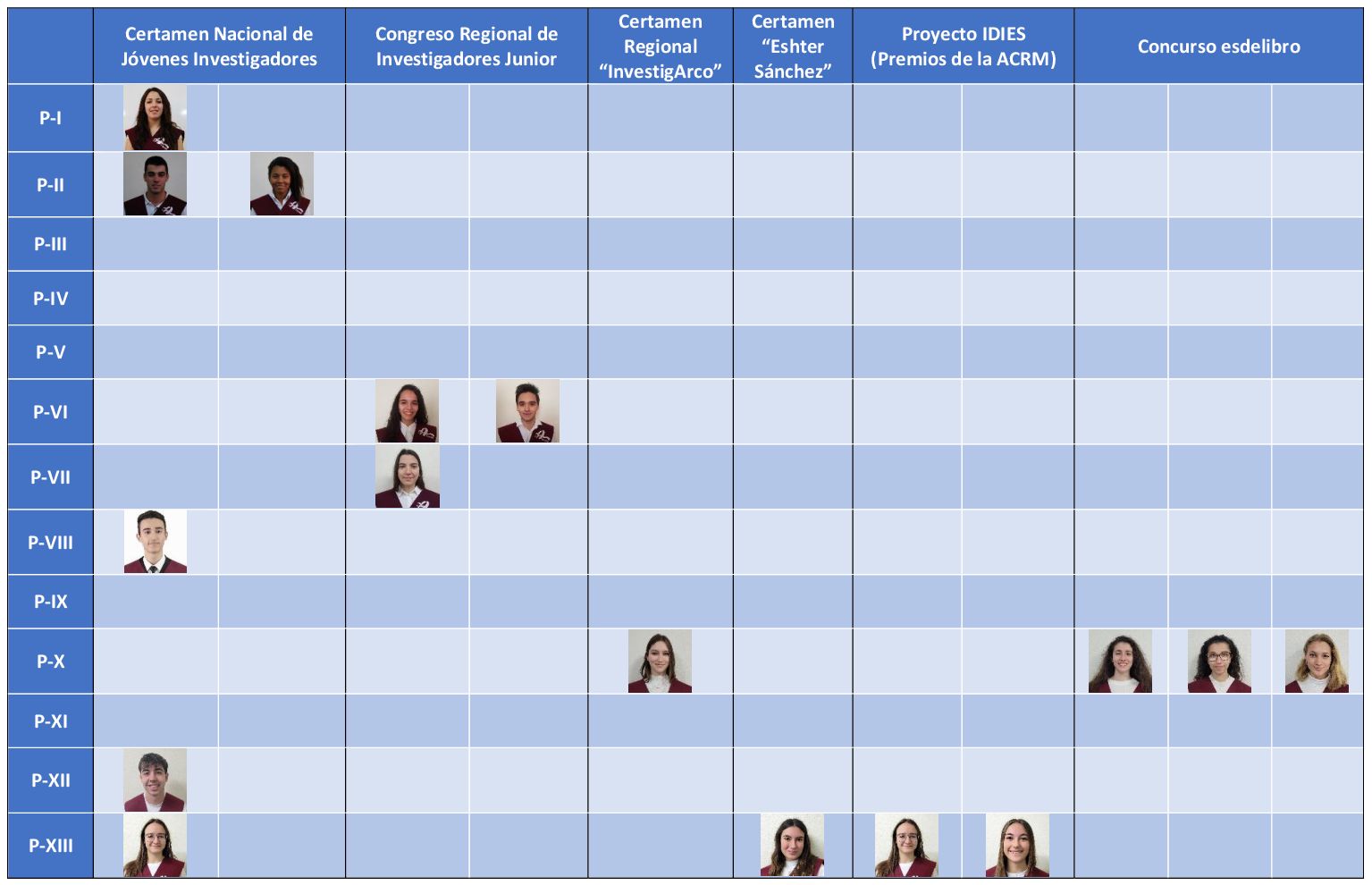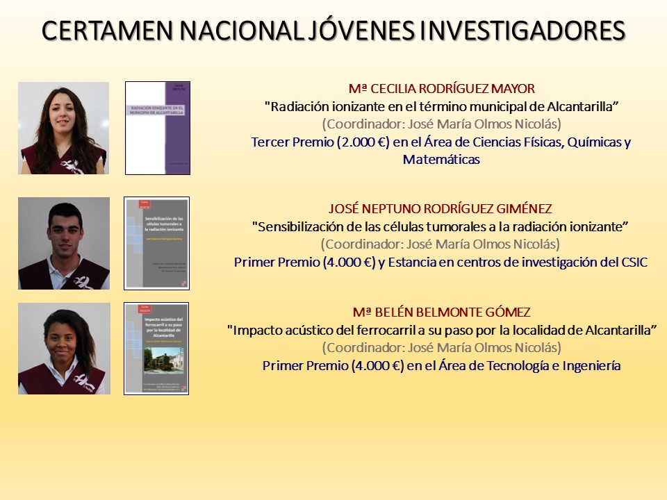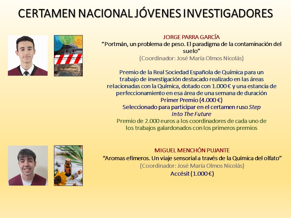 En el caso del Certamen Nacional de Jóvenes Investigadores, han sido elegidos para participar en el mismo y galardonados con alguno de los premios otorgados seis alumnos pertenecientes a la primera (Mª. Cecilia Rodríguez Mayor), segunda (José Neptuno Rodríguez Giménez, Mª. Belén Belmonte Gómez), octava (Jorge Parra García), decimosegunda (Miguel Menchón Pujante) y decimotercera promoción (Nuria Almela Martínez).