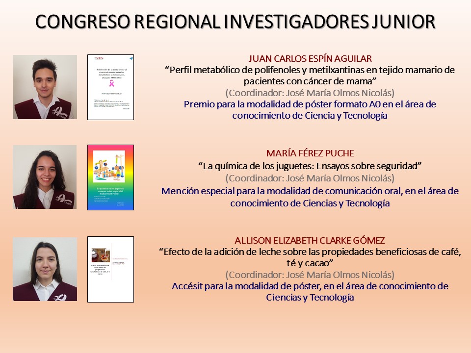 Aunque en el Congreso Regional de Investigadores Junior han participado alumnos de todas las promociones, solo se han otorgado premios en las últimas ediciones. En este evento han sido galardonados tres alumnos pertenecientes a la sexta (Juan Carlos Espín Aguilar y María Férez Puche) y séptima (Allison Elizabeth Clark Gómez). La suspensión de este evento en el curso 2020/21 por los efectos de la pandemia impidió optar a los premios de este Congreso a los alumnos de la novena promoción.