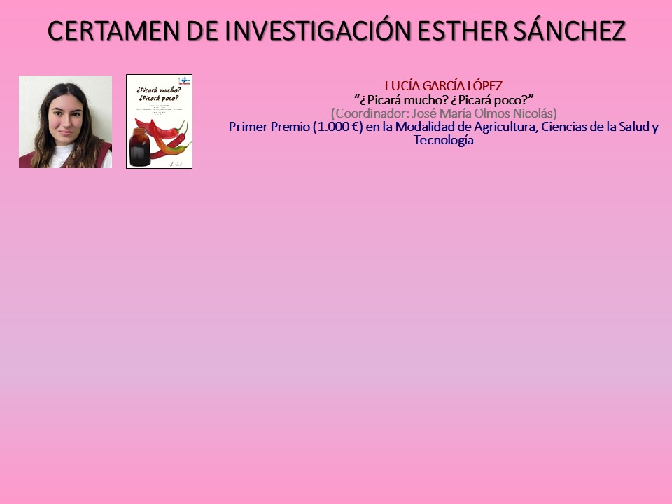 En las ediciones convocadas del Certamen de Investigación «Esther Sánchez» ha sido galardonada una alumna perteneciente a la decimotercera promoción (Lucía García López).