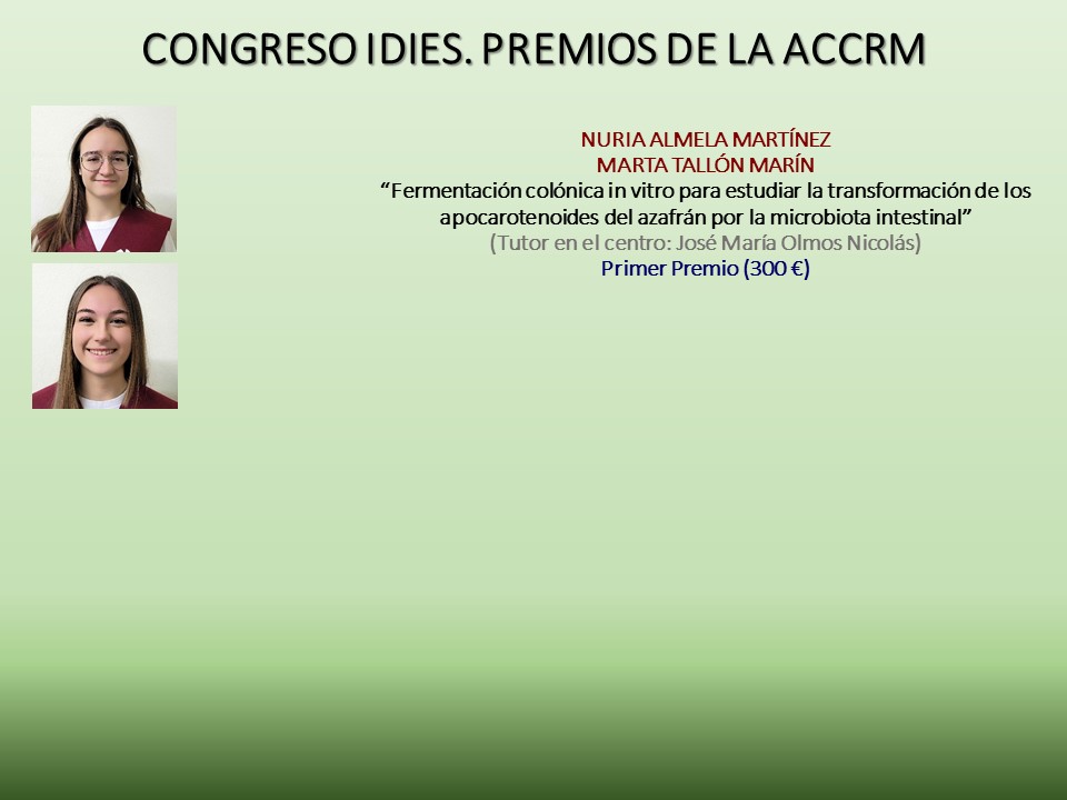 En las ediciones del Proyecto IDIES en las que la Academia de Ciencias de la Región de Murcia ha otorgado sus premios ha sido galardonado un grupo de alumnas pertenecientes a la decimotercera promoción (Nuria Almela Martínez y Marta Tallón Marín).
