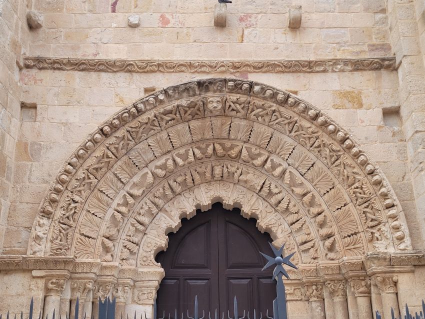 Las arquivoltas se cubren con abundante decoración vegetal, y entre ello se esconde un obispo con casulla, mitra y báculo que es tradición buscar.