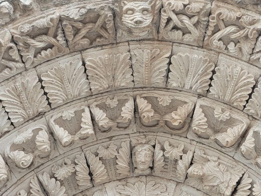 Las arquivoltas se cubren con abundante decoración vegetal, y entre ello se esconde un obispo con casulla, mitra y báculo que es tradición buscar.