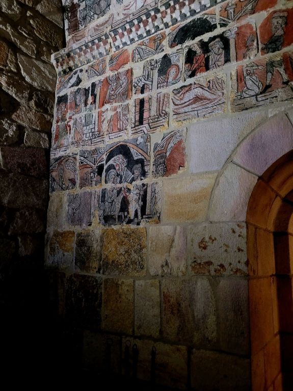 Durante la restauración de 1959 se descubrieron restos de pintura mural de estilo gótico lineal realizadas en negro y rojo.