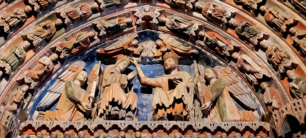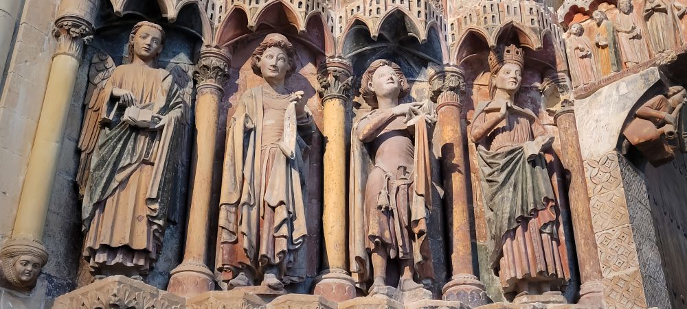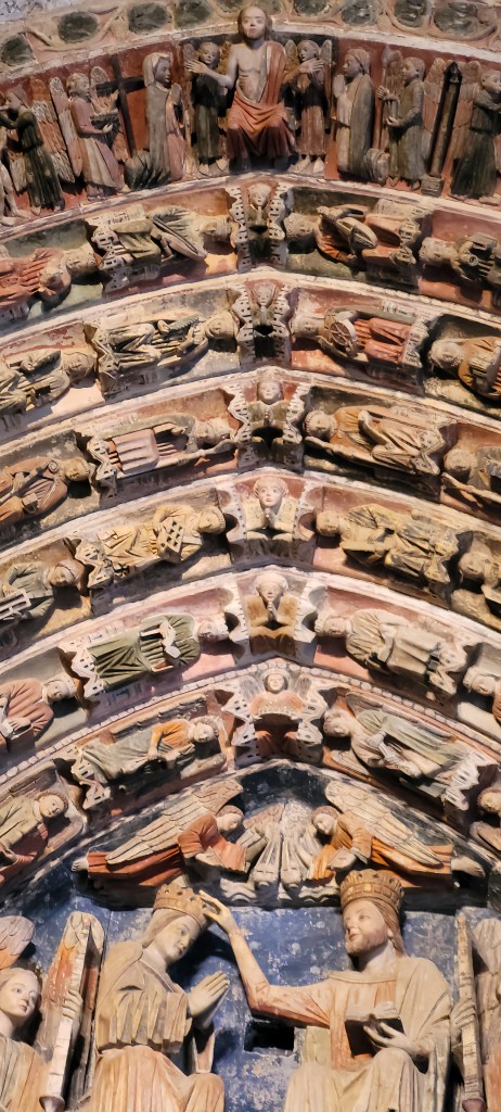 En la última arquivolta se exponen en posición radial las figuras del ciclo del Juicio Final: un Cristo Juez humanizado por el espíritu risueño del gótico, ángeles con los instrumentos de la Redención, la Virgen y san Juan en actitudes intercesoras, la resurrección de los muertos, asexuados, y, en hileras divergentes, bienaventurados y réprobos camino del cielo y del infierno.