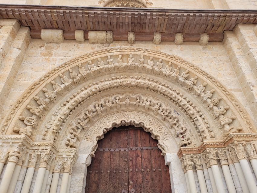 Fue planteada en estilo románico en días de Fernando III y proseguida hasta su terminación en gótico por dos maestros formados en León, durante el reinado de Sancho IV. Su preceptor, el franciscano Juan Gil de Zamora, idearía sus dos densos y originales programas iconográficos. Uno, dedicado, en consonancia con el incremento de la devoción mariana en el siglo XIII, a la exaltación de la Virgen y de la Iglesia por ella simbolizada en su paso por la tierra, su muerte, asunción y coronación en el cielo. El otro, sobre el tímpano, una representación selectiva de la Iglesia triunfante se sucede en las arquivoltas: ángeles, apóstoles, mártires, obispos y abades, vírgenes y dieciocho músicos con un variado e interesante repertorio de instrumentos.