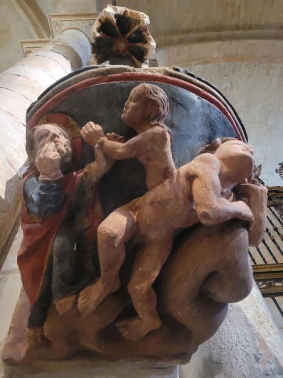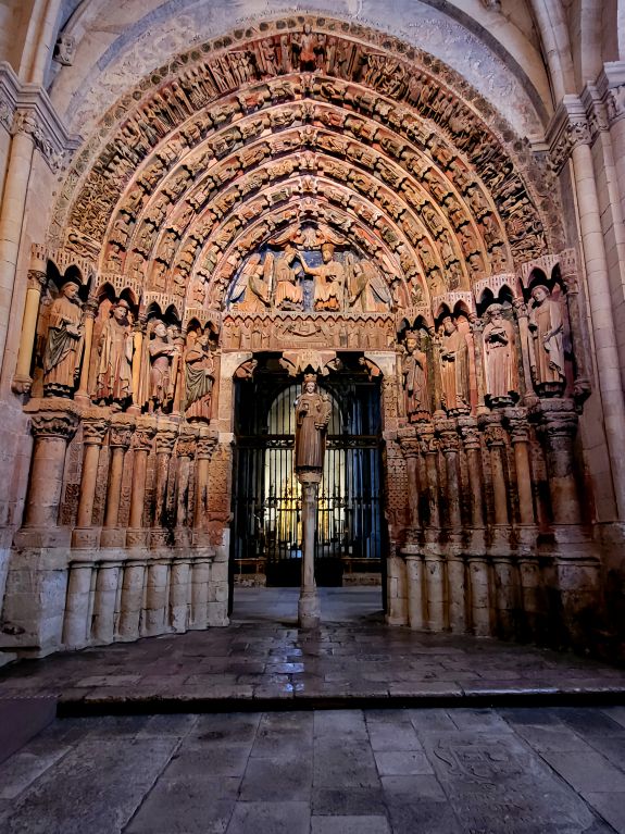 De notoria calidad son los trabajos escultóricos de la primera etapa constructiva, centrados en los capiteles de la cabecera y en la Puerta Septentrional, que acusa la huella del gran legado que el maestro Mateo hizo a Santiago de Compostela y aporta un rico muestrario de instrumentos musicales tañidos por los Ancianos del Apocalipsis en torno a una manifestación de la divinidad de Cristo, flanqueado por los santos intercesores, la Virgen y Juan.