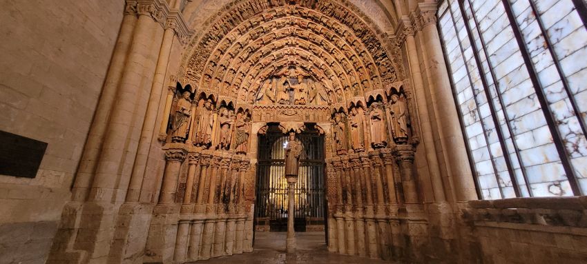 La Portada occidental, denominada De la Majestad, fue labrada y policromada en el último cuarto del siglo XIII, y es una de las más importantes manifestaciones de escultura monumental del período gótico en Castilla.