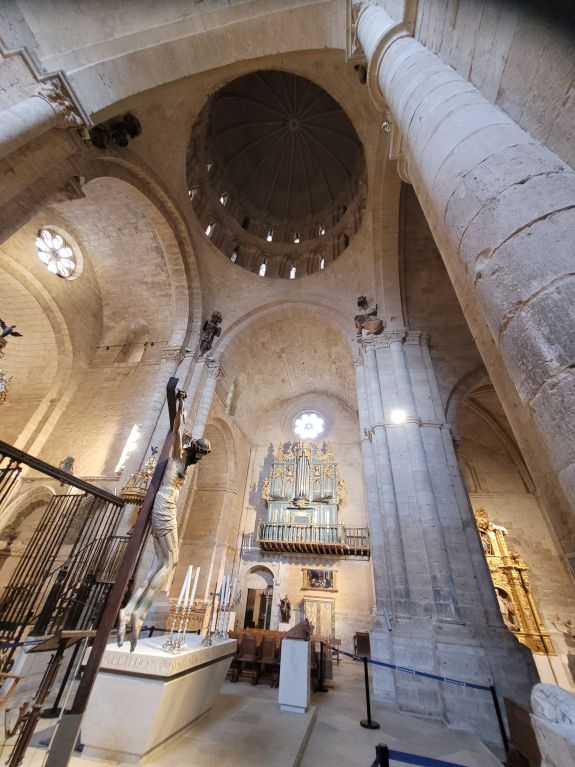 A continuación se volteó también el arcaizante cañón apuntado de la nave central, donde los pilares estaban concebidos para recibir nervaduras, y, a la postre, desechando la opción de cubrir el crucero con una solución de crucería similar a la que tuvo el monasterio cisterciense de Moreruela, se levantó un cimborrio espectacular que imita con demérito al salmantino, al que sobrepasa sólo en dimensiones.