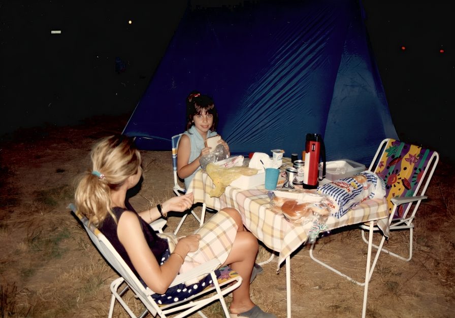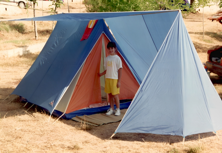 Llegamos al Complejo Los Enebros, en Arroyo Frío ya de noche. El camping tenía ese encanto sencillo de los lugares donde lo importante no es el lujo, sino el entorno. Parcelas delimitadas por setos bajos, suelo de tierra firme, sombra generosa de pinos y enebros que filtraban la luz en destellos verdes. Algunos jovenzuelos se prestaron a ofrecernos su ayuda para instalar el campamento. No era necesaria, contábamos con nuestra ilusión para que aquella aventura resultara inolvidable, y qué mejor ocasión para comenzarla que montando entre los tres nuestra tienda de campaña.