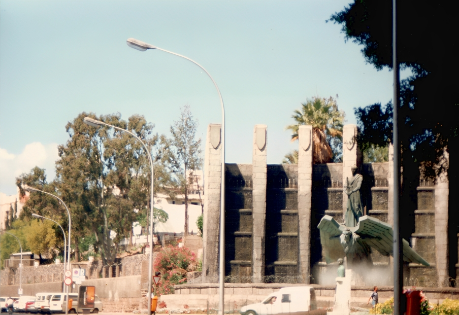 La plaza, que ocupa un espacio de algo más de cinco mil metros cuadrados, está presidida por el Monumento a los Caídos, una torre en forma de cruz con un mirador en lo alto, cuya base contiene una cripta ya vacía. Este monumento fue construido por idea del Capitán General García Escámez durante el Mando Económico, tras la Guerra Civil. Rodeando la base se encuentra un conjunto escultórico proyectado por Enrique Cejas Zaldívar y Alonso Reyes.