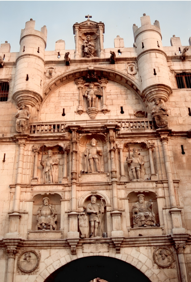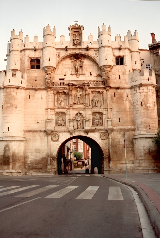 A pocos pasos se encuentra la Puerta de Santa María, antigua puerta principal de la ciudad medieval. Su estructura, flanqueada por torres y coronada por esculturas de personajes históricos vinculados a Burgos, actúa como un umbral simbólico entre el pasado y el presente. La piedra, trabajada con precisión, muestra escudos, hornacinas y relieves que recuerdan la importancia estratégica y cultural de la ciudad en la historia castellana.